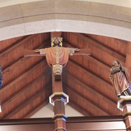 The tabernacle is on the reredos’ surface with candlesticks, and a traditional altar table is in front. An open rood screen demarks the sanctuary; the Christ figure is a chasuble-wearing welcoming Jesus. The chapel for the Presence is to the west, off the transept arm. The organ pipes fill the wall over the choir loft at the main entry. Across the parking lot, a community fair was going on around the high school.