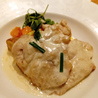 At dinner I was one of eight, and started with a cantaloupe melon cocktail. Tom Kah Gai soup next, and then pan-fried turkey scallopine. And a chocolate slice of something for dessert.