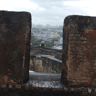 First stop on the tour was the furthest point west: el Moro, were we got closer to the wall overlooking the cemetery. It was a cloudy, blustery day, with dark overcast clouds. Eastward, with 50 minutes to climb about and explore the San Cristobal Fort, this tour became a great option. Despite my fear of heights, I climbed wet, slightly slippery stone to reach the parapet, where I took pictures with the zoom to spots outside the fort, as well as within.