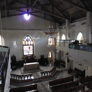 Down a slight hill, the St Thomas Reformed Church occupied the corner. With tall white columns and red-shuttered windows and doors, it spoke to the Dutch presence on the islands. Another block east, and I turned left and began climbing a hill. Up on the left was the Cathedral Church of All Saints and its school, with the offices across the street. After being advised by a student’s mother to enter via the school, I notified the school office of my presence and intent to visit the church, and climbed the stairs by the short bell tower to enter from the south side. A smaller building, the altar was at the east end, below a stained-glass window with the seats for the bishop and the dean bracketing. Looking from the altar to the west, stairs offered access to the loft and organ, over a single narrow doorway. I climbed and got a few overhead shots of the altar and some of the smaller stained-glass windows. Again, I was adapting to the ambient light.
