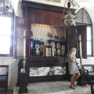 Sitting on the stairs, I was soon greeted by a woman guide who had just concluded a tour, letting that couple out. After being quizzed on my knowledge of Judaism, she escorted me into the sanctuary where dark wooden pews sat on sand. As the second oldest synagogue in the western hemisphere (after Curacao, where I’d visited in 2018), rebuilt many times, this building dated to 1833. Opening the shutters to expose the 7 scrolls of the Torah, she pointed to the two oldest, gifts from Curacao, which had survived fires and earthquakes. While six larger scrolls wrapped in blue and silver leaned against the cabinet wall, a wooden-encased Sephardic scroll sat in the center. In the gift shop I offered a donation, as I didn’t need another souvenir.