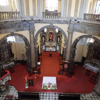 The eight arched three-panel windows at 6-meter above the nave floor admitted plenty of light, making shots of the three altar shrines below them difficult due to shafts of sunlight contrasting with shadows. Ornate, with filigree and embellishments, the columns were red rose marble and statues white stone. Several of the windows had modern stained-glass. The altar table stands in front of the apse and the altarpiece backing the traditional high altar. The cathedra of dark wood, had a rope to prevent the curious from taking the bishop’s throne. A gallery encircles the nave, with the pipe organ over the entrance door, exposed pipes to either side. A further level up, reduced in diameter, is blank dome with a small lantern light bearing the symbol of the Holy Spirit.