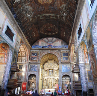 Outside on the square facing the entrance was a street market, so we strolled with lookers and buyers as we headed to the University church. (Igreja de São João Evangelista do Colégio do Funchal) Lovely, the blue-and-white tile complemented the red murals and gilding of the main altar and side chapels.