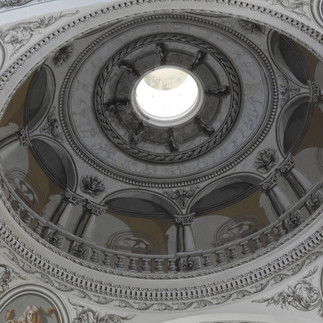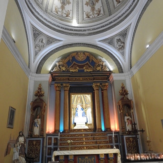 Retracing my steps, I began my serious photo taking of the Catholic cathedral. Pale yellow with white trim, statues stand over the corner entrances, while above the main two levels more stand with a cross at top. After a temperature check and a squirt of disinfectant gel, I was allowed into the nave. The central aisle continues the white and light yellow palette, with added gold filigree in the arches and in the ceiling vault. Domed at the crossing and painted in trompe l’oeil, the center has a lantern allowing light to enter. The cathedra sits behind the main altar, in a recess for the choir, I suspect, made of what looks like gold burnished dark wood. With chapels under half-domes at the transept, statues of saints lined the walls in niches. [Along with trying to photograph the cathedra when I visit a cathedral, I have also taken to studying each church’s Stations of the Cross, usually photographing the thirteenth one, the Descent from the Cross. Here, there are two sets of stations, the traditional, and a 2015 set where the 13th is labeled La Vigilia, and is part of the Stations of the Resurrection. Something new for me, these devotionals celebrate the 50 days from Easter to Pentecost.]