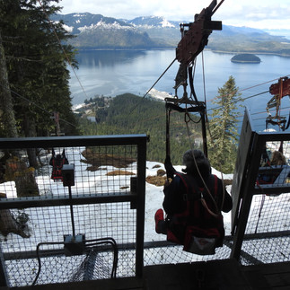 Back to the port, we were directed to a building where we were checked out before being allowed to head up 1600-feet to the tram’s top. Once there and surrounded by trees and dirty snow, we walked down a fairly steep muddy gravel road to the zipline launch.