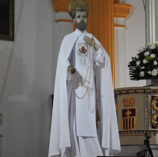 The Church of Our Lady of Mercy is white with the now-familiar red painted trim. Tall and imposing, it was in remarkably good shape, and lightly occupied. With two side aisles in addition to the “normal” center aisle, there was much better air-flow as I walked alongside golden-yellow half-columns delineating shallow arches. A single side chapel filled one arch to the right, with a statue of La Merced bracketed by a Christ from Calvary and St John the Baptist. At the far end, the high altar was behind a wonderfully carved dark wooden altar rail, a statue of Mary below a columned half cupola, and a pair of statues. These were of two bearded men, probably saints, in full white robes. A crest of their order was sewn into the garments over their chests, and they carried the symbols of their sainthood, which I couldn’t recognize. That crest appeared in some of the stained-glass windows. Any thoughts out there?