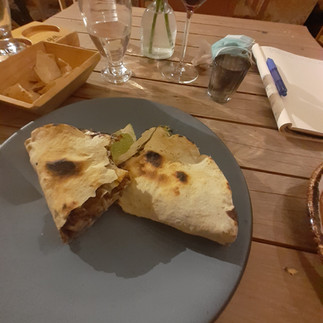 Spotting a Cocina Oaxaqueña, I was seated at Nostalgia with a glass of the house cab-malbec blend. I ordered a starter of papas frites con ajo and a main of tlayudas. [Fried potatoes with garlic, and large tortilla dehydrated with lard, refried beans, quesillo, avocado, cabbage, beef and chorizo.] Seated across and up from me (as we were within the courtyards of several adjoining buildings) was a foursome of Lithuanians with a small child who was obviously just starting to walk and required constant attention.)